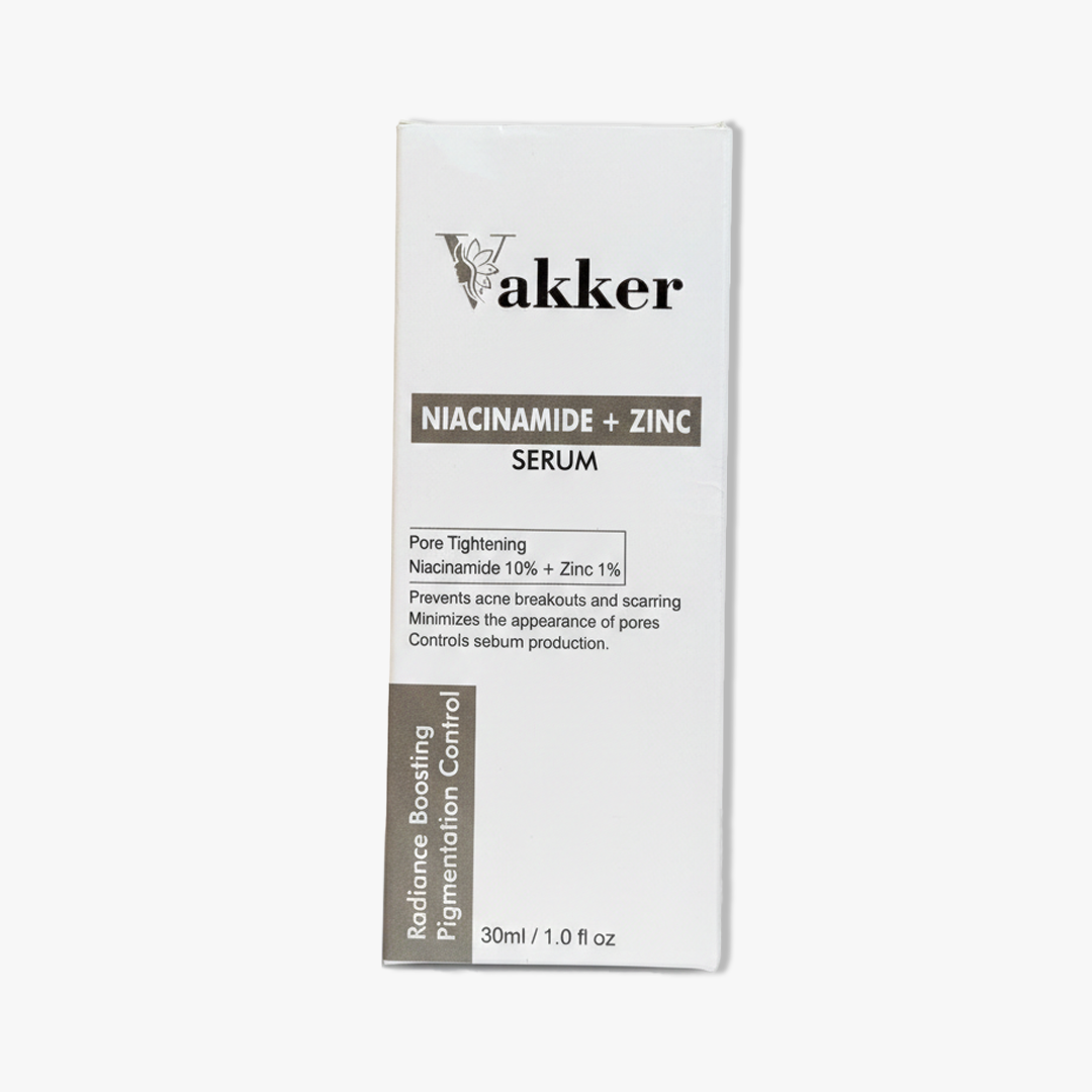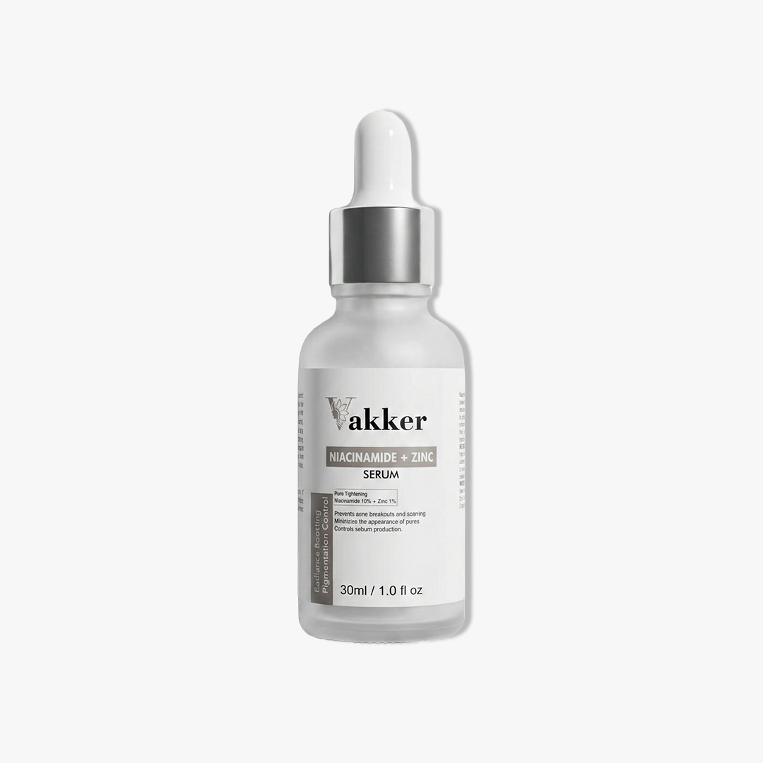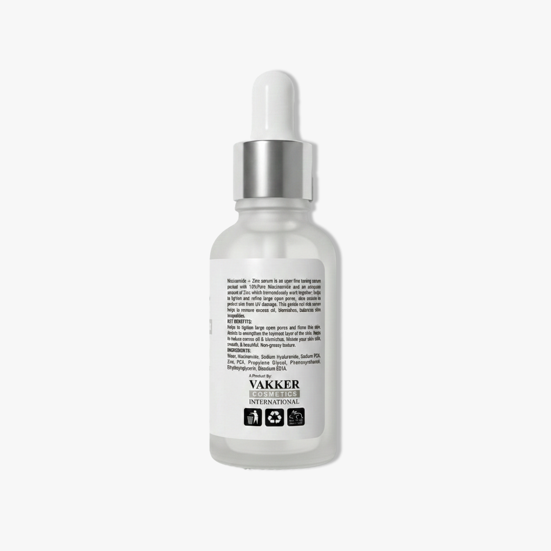 Vakker Niacinamide + Zinc Serum – Clear, Balance, and Refine. Achieve a balanced, blemish-free complexion with Vakker’s Niacinamide + Zinc Serum. Formulated with 10% pure Niacinamide and 1% Zinc, this powerful duo targets enlarged pores, controls excess oil, and reduces acne breakouts. Lightweight and non-greasy, it strengthens the skin’s barrier while fading dark spots and calming redness for a smoother, clearer look.