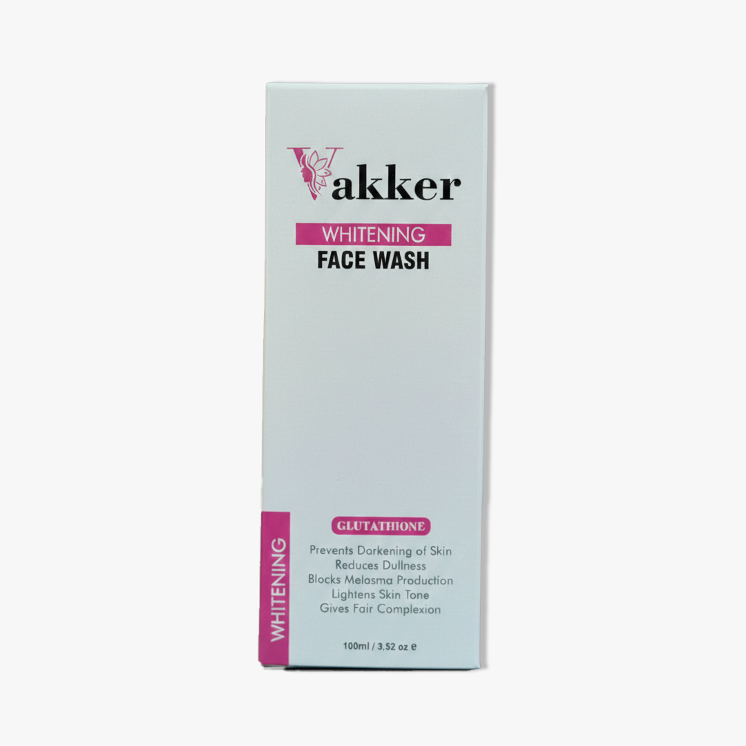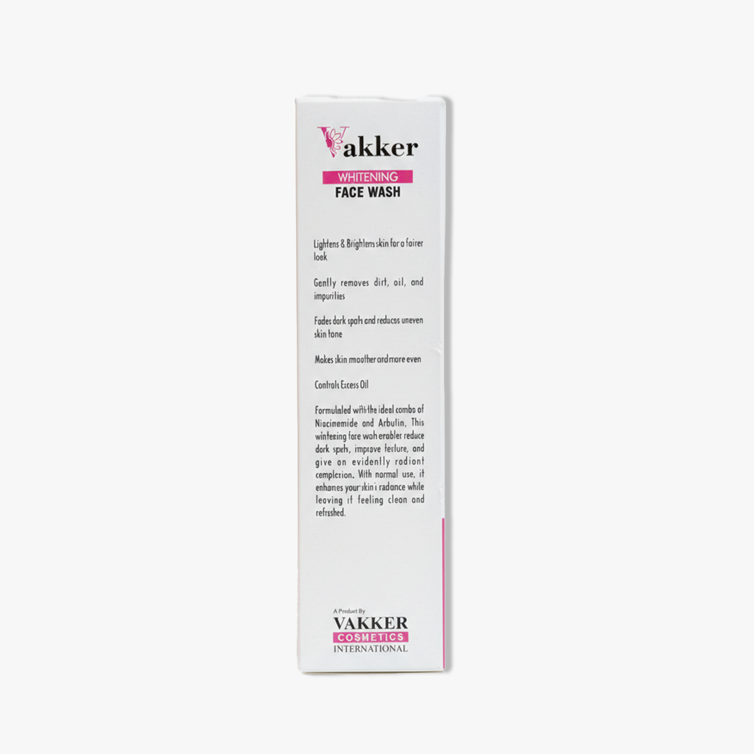 Vakker Whitening Face Wash – Glow, Lighten, and Refresh. Reveal a fairer, more radiant complexion with Vakker Whitening Face Wash. This specialized cleanser features a powerful blend of Glutathione, Niacinamide, and Arbutin to actively block melanin production and fade dark spots. It gently removes dirt and excess oil while nourishing the skin with Vitamin A and Carrot Extract, leaving your face feeling smooth, bright, and deeply refreshed.
