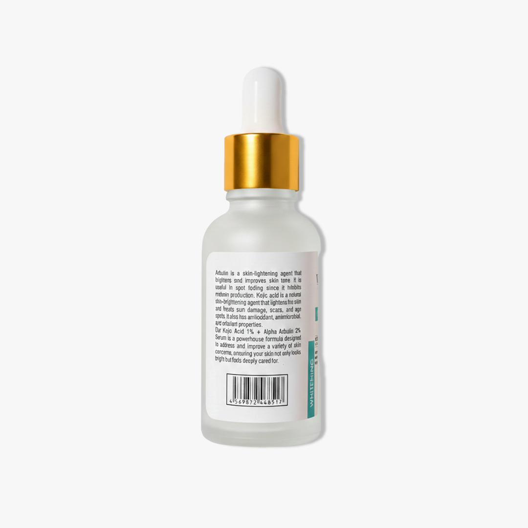 - Vakker Whitening Serum – Brighten, Glow, and Even Tone. Reveal a luminous complexion with Vakker’s Whitening Serum. Powered by a potent blend of 1% Kojic Acid and 2% Alpha Arbutin, this serum targets stubborn dark spots, melasma, and uneven skin tone. It works to inhibit melanin production, naturally lightening the skin while fading sun damage and age spots. Experience a radiant, natural glow with skin that looks brighter and feels deeply cared for.